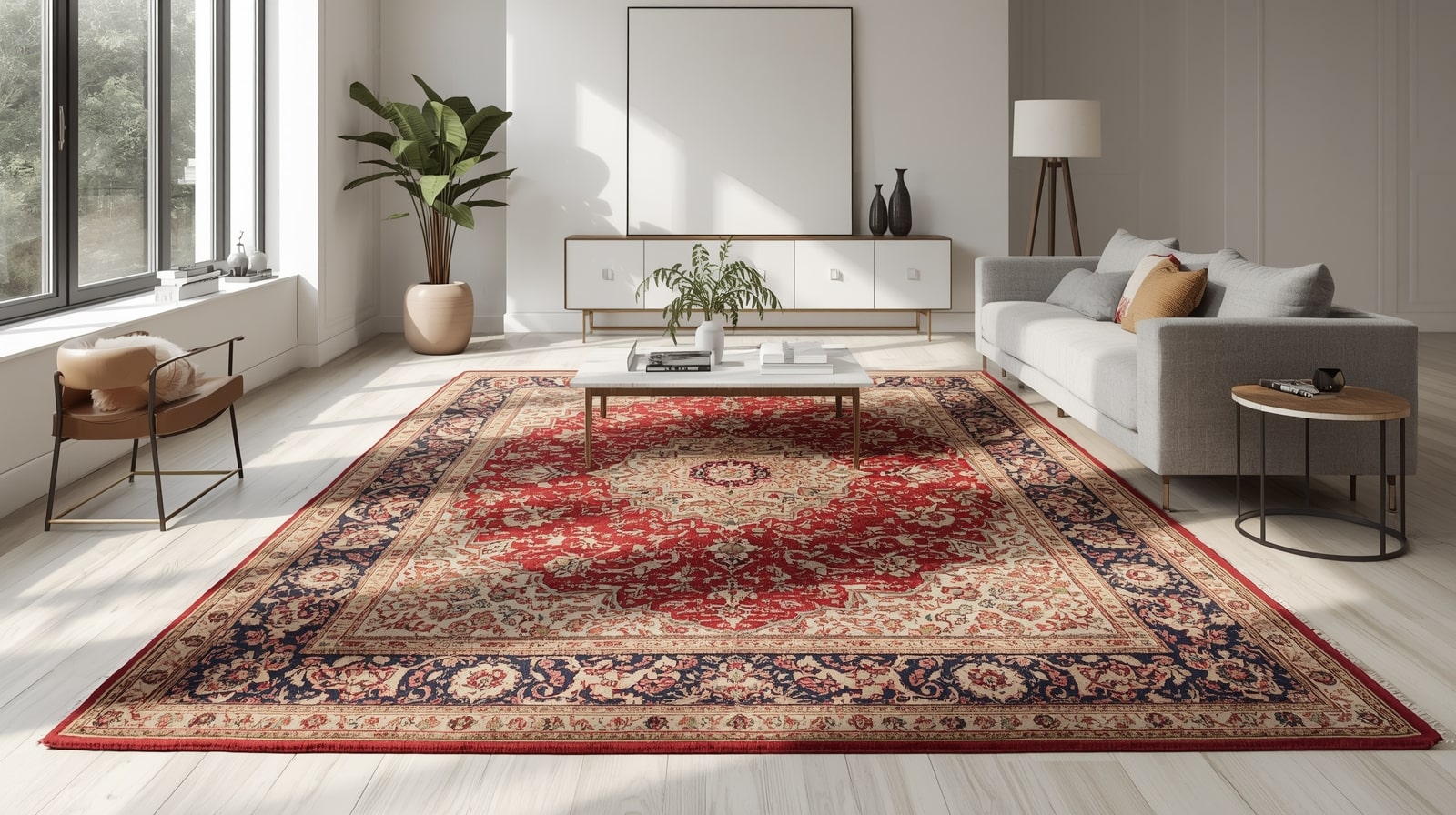 A red Persian rug can be surprisingly versatile when it comes to color coordination. The secret lies in understanding how different red tones interact with your modern palette. Deep burgundy or wine-red rugs work beautifully with cool neutrals like gray, white, and black—creating a sophisticated, gallery-like feel. Meanwhile, brighter reds or those with orange undertones bring warmth and energy, ideal for pairing with beige, cream, or even muted pastels.